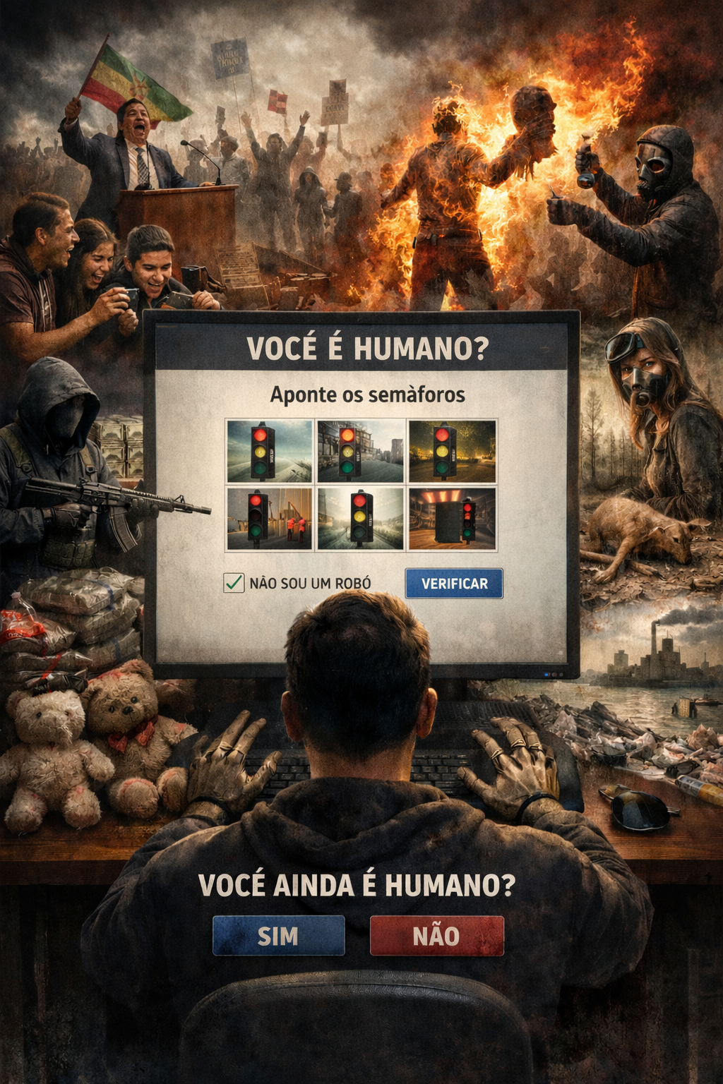 As redes sociais vivem nos perguntando se somos humanos.“Marque os semáforos.”“Prove que não é um robô.”“Confirme sua identidade.” Bastam alguns cliques.E pronto: você está autorizado a existir. Curioso. Nunca nos perguntam se sabemos sentir.Nunca nos perguntam se sabemos respeitar.Nunca nos perguntam se sabemos cuidar. Enquanto isso, humanos “verificados” destroem países em nome de ideologias, transformam mentiras em bandeiras, ódio em discurso, violência em projeto.Com perfil autenticado e consciência desligada. Adolescentes riem enquanto machucam.Filmam a crueldade.Transformam dor em entretenimento.E curtidas em medalhas. O crime organizado não se esconde mais.Ele tem marketing.Tem…