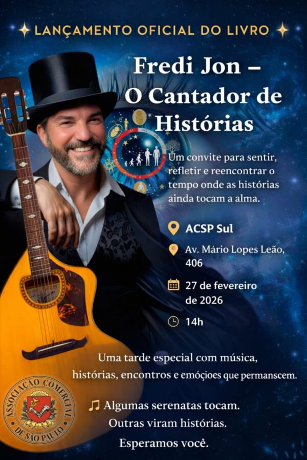 Esse é um dos episódios centrais de Fredi Jon – O Cantador de Histórias, obra que reúne 25 anos de apresentações vividas pelo músico e seresteiro e que será lançada no dia 27 de fevereiro de 2026, a partir das 14h, na Associação Comercial de São Paulo (ACSP).
